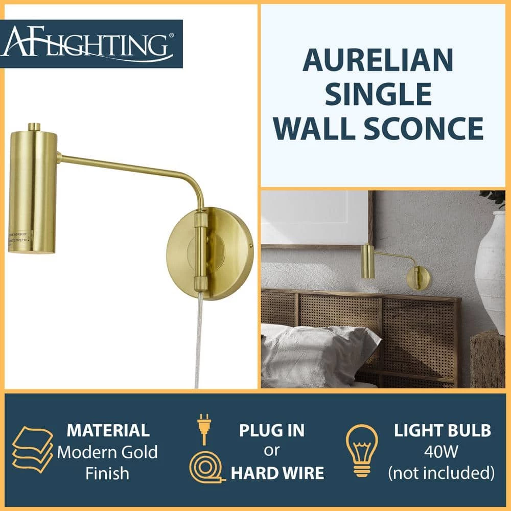 Illuminate your room with the Aurelian Single Wall Sconce. This sconce’s gold finish complements the aura of your contemporary home decor. It’s also constructed from metal, which is sturdy and durable and the gold shade adds interest and completes its unique style. This piece is perfect for adding more light to your room as you read or adding a pop of gold to any living space. This modern style light is an exclusive design for AF Lighting.