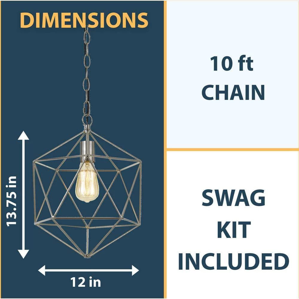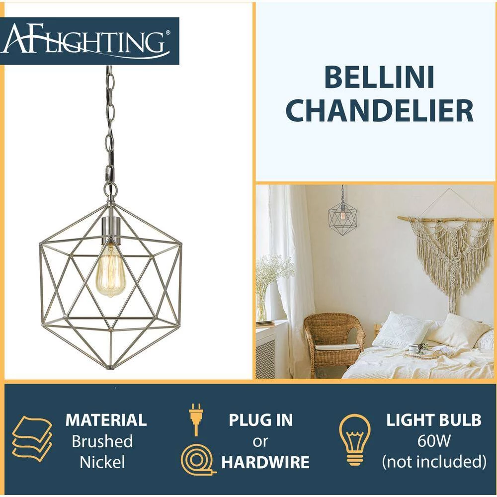 Although simple in design, this Bellini one-light chandelier in brushed nickel has a wonderfully sophisticated look. The geometric-shaped light provides elegant minimalist style in any interior. This chandelier is versatile and can be hung as a swag lamp or professionally installed as a ceiling fixture with a hardwired connection. This modern style light is an exclusive design for AF Lighting.