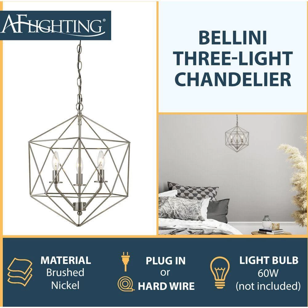 Although simple in design, this Bellini three-light chandelier in brushed nickel gives your home plenty of light and has a wonderfully sophisticated look. The geometric-shaped light provides a modern, minimalist style in any interior. This chandelier is versatile and can be hung as a swag lamp or professionally installed as a ceiling fixture with with a hardwired connection. This modern style light is an exclusive design for AF Lighting.