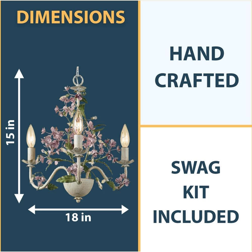 The AF Lighting 7044-3H Grace Three-Light Chandelier features cut metal with an antique cream finish. This country-style chandelier is part of the Elements series and uses three 60-Watt candle base bulbs (not included). It comes with hard-wire and swag-kit options and due to handcrafting, no two are alike. This modern style light is an exclusive design for AF Lighting.