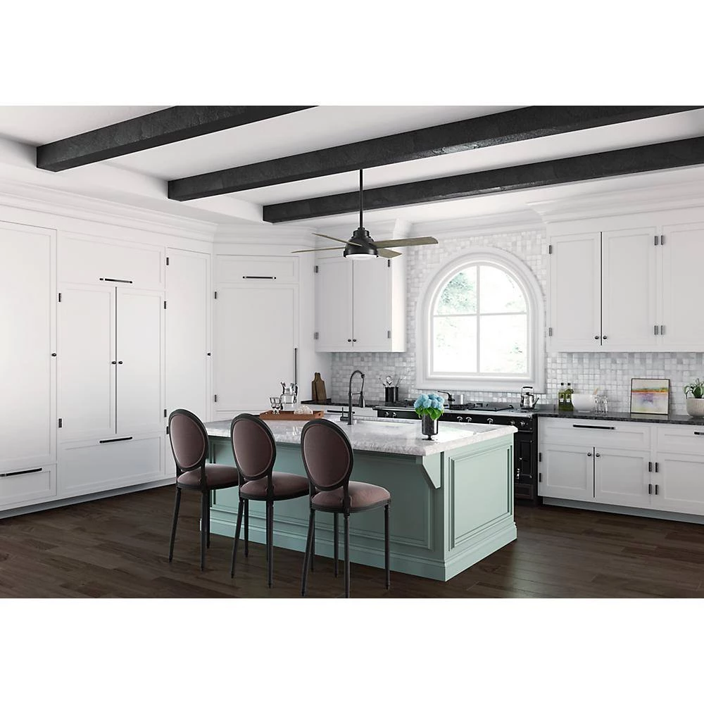 The Levitt modern industrial style ceiling fan is inspired by factory hood lighting with its curved bell shape, cased white glass and an integrated LED light. Rustic, hand painted real wood veneer blades compliment the nostalgic era of the fan body. The Levitt features a Casablanca exclusive wall control with the receiver preinstalled for easy installation. Explore this rustic ceiling fans various sizes and finishes to find the best ceiling fan for your decor while maintaining the style you love throughout your home.