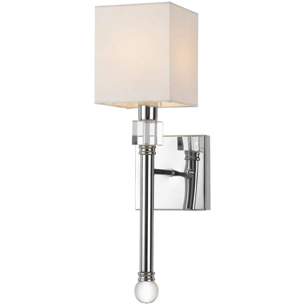 Illuminate your home with the Sheridan wall sconce from AF Lighting. This sconce provides the perfect blend of style and function; perfect for lighting up any hallway, entryway and vanity. The frame is covered in a beautiful chrome finish that integrates well with existing color schemes. Two crystal ornaments are located in the center and bottom of the base. When the light is on, these crystals create a beautiful prismatic effect as the light shines through. The sconce is topped off with a square hardback shade in beige to complete the look. This modern style light is an exclusive design for AF Lighting.